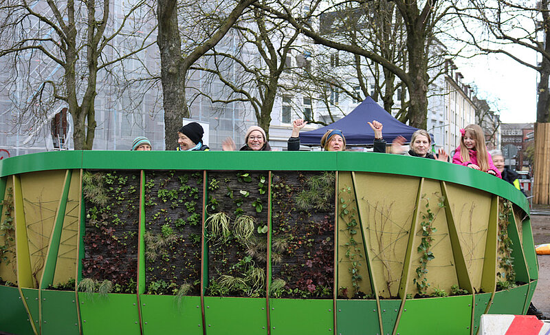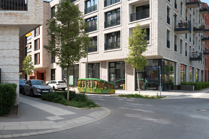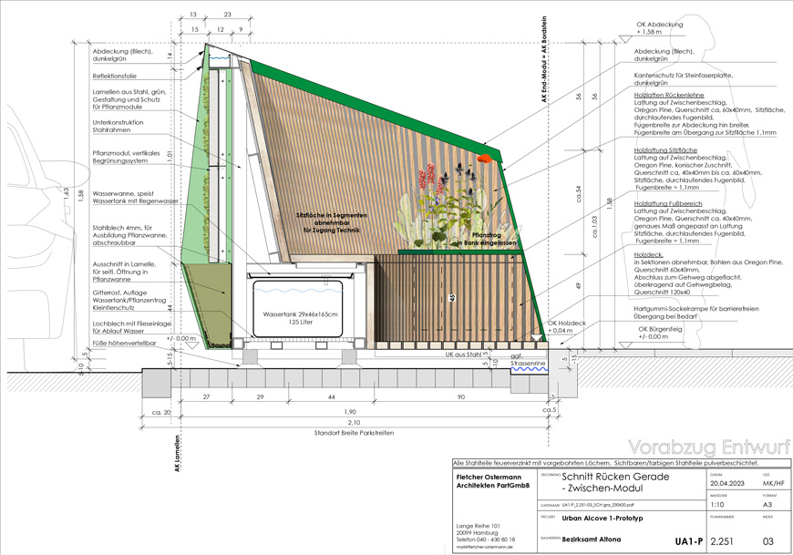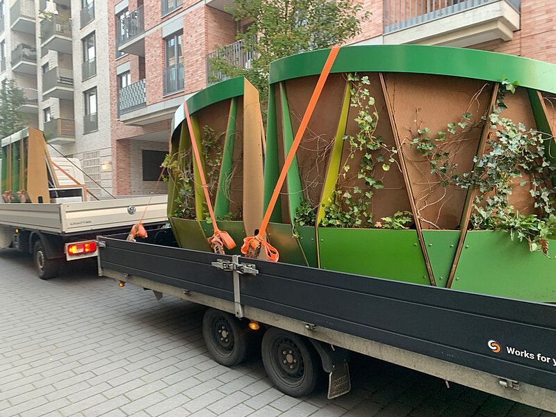 Um in Trockenperioden eine konstante Bewässerung zu ermöglichen, bietet ein integrierter Wassertank die Möglichkeit Wasser zu speichern und über einen längeren Zeitraum abzugeben. Mit einem vertikalen Vliesboden und einer kleinen Wasserpumpe werden die eingesetzten Pflanzen durch Kapillarkräfte aus dem Wassertank bewässert. Durch den modularen Aufbau können einzelne Bausteine ausgetauscht oder nachgerüstet werden. Als Teil des ökologischen Konzepts sind für den Bau nachhaltige Materialien, wie Naturholz und Rockpanel, eine nachhaltige mit Basaltfasern hergestellte Fassadenplatte, verwendet worden.